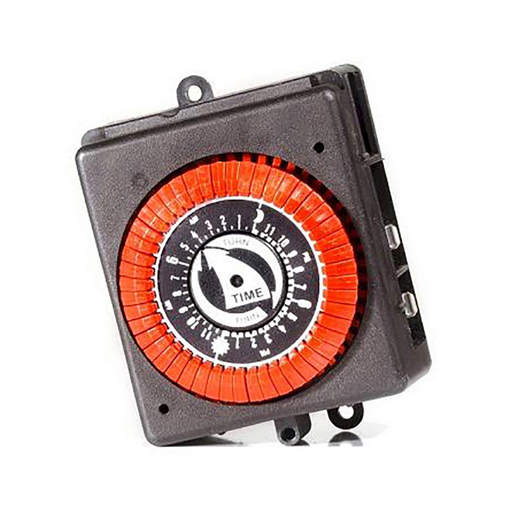 The Intermatic 40-100-1020 Time Clock utilizes a mechanical dial and tabs for setting filtration schedules.