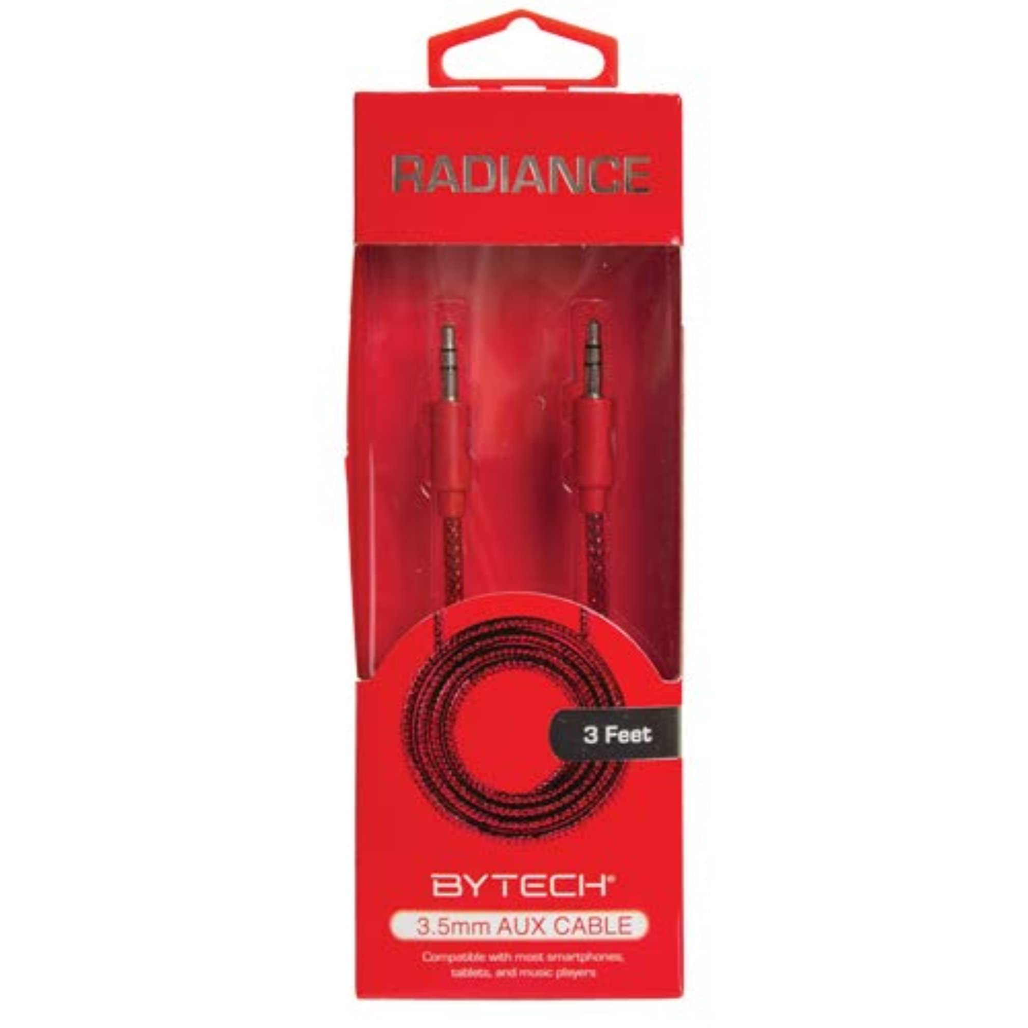 The Bytech BYAXAU103AC is a 3-foot braided auxiliary audio cable designed for connecting audio devices. Its braided outer material enhances durability and prevents tangling. This cable features male-to-male auxiliary connectors for universal compatibility with standard 3.5mm audio jacks.