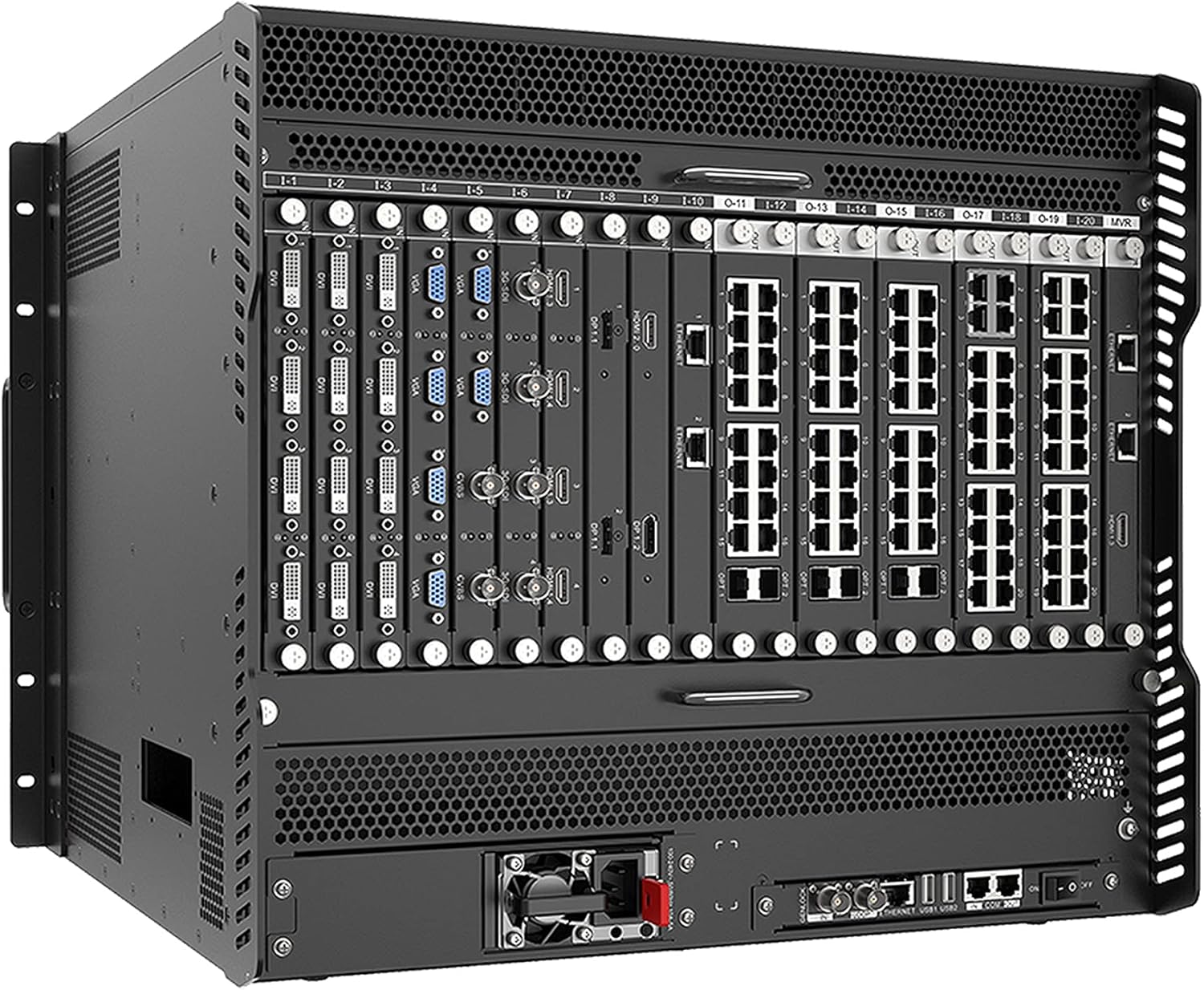 - Input Modules (e.g., DVI, VGA): Connect your video sources (e.g., computers, media players) to the corresponding input ports on the front panel modules. Labels such as "DVI" and "VGA" are clearly marked.