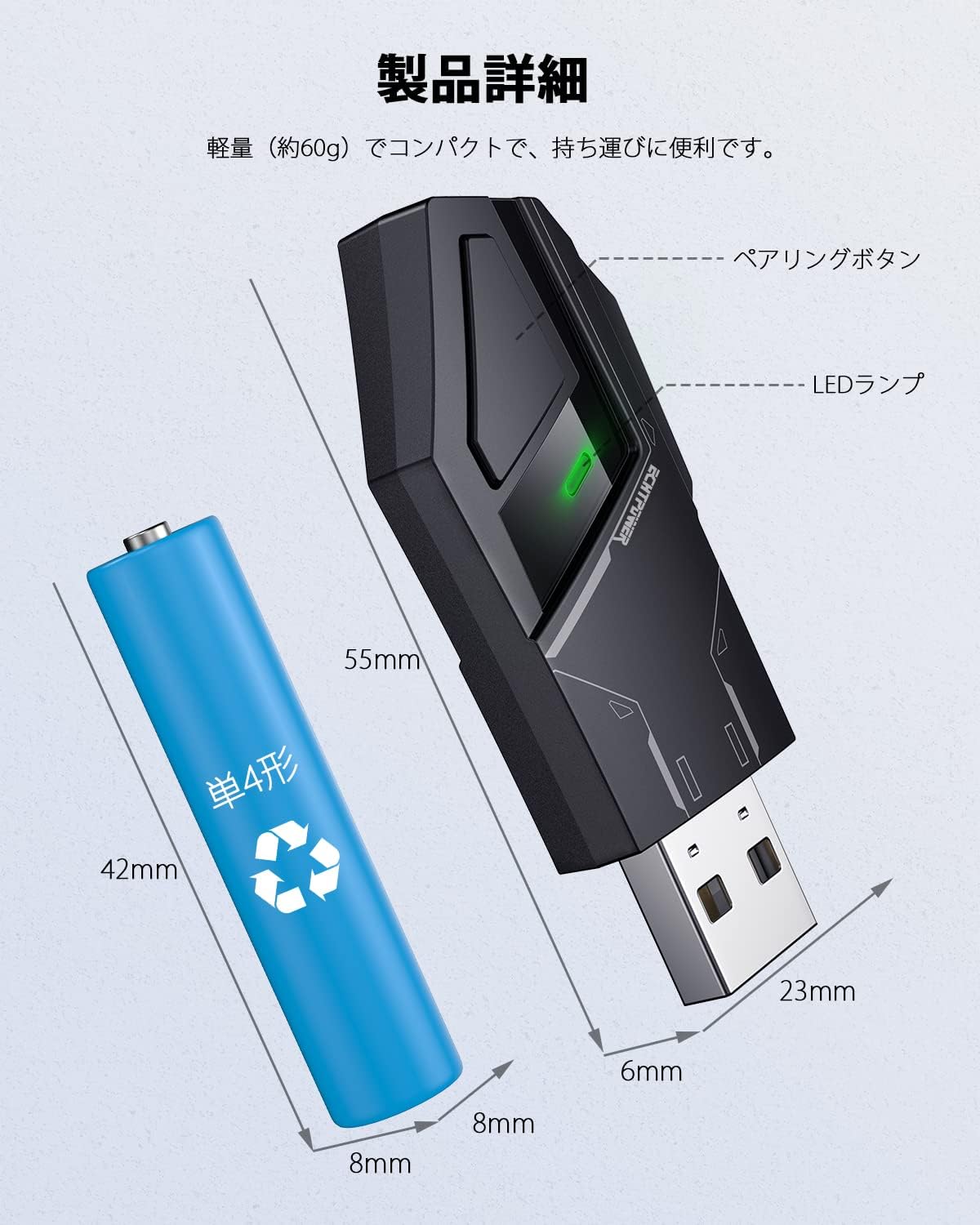 Figure 3.1: Dimensions of the ECHTPower MC-P5006 Adapter. This diagram provides the physical dimensions of the converter adapter (55mm length, 23mm width, 8mm thickness) and compares its size to a standard AAA battery.
