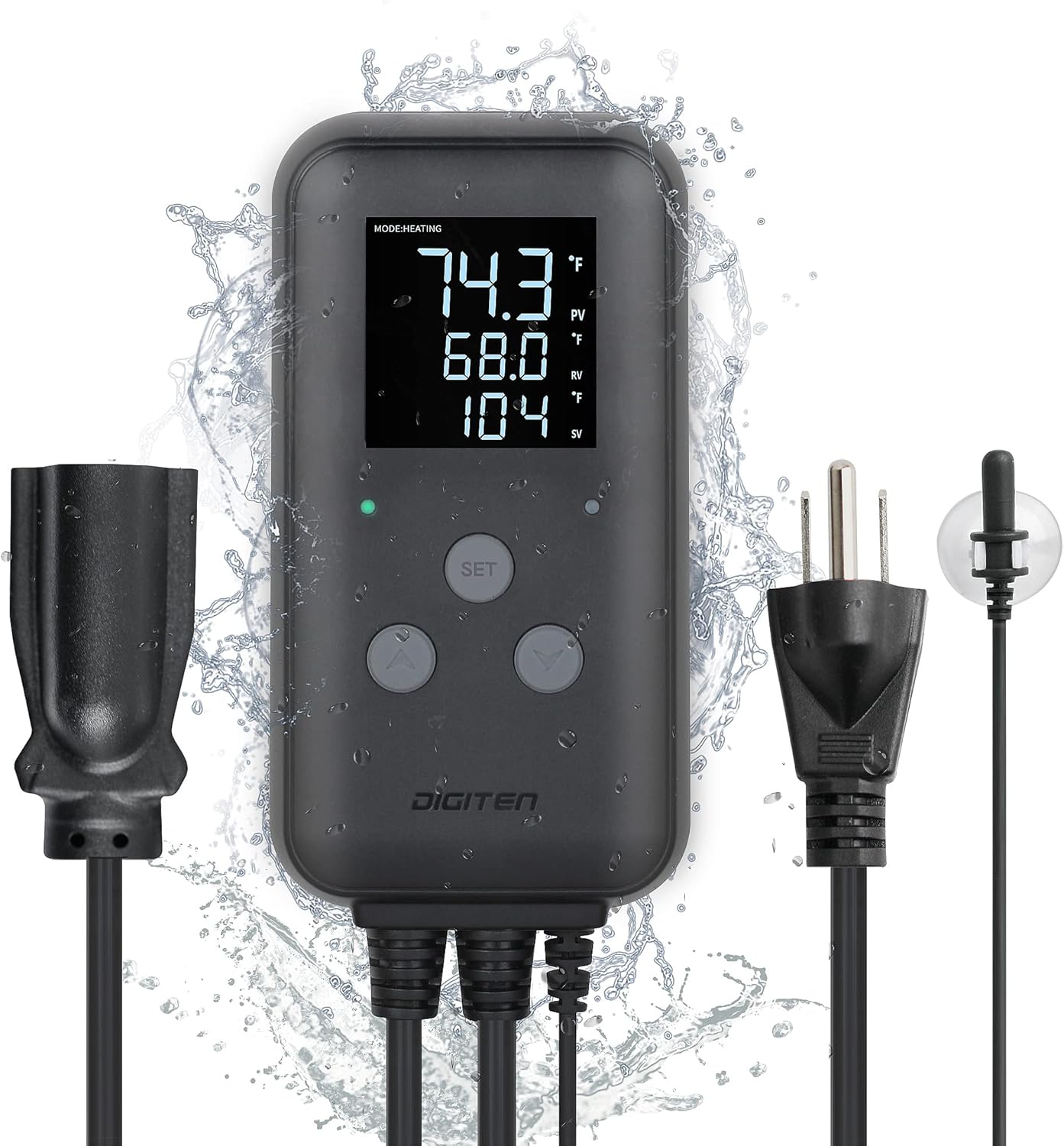 The DIGITEN DTC310 Waterproof Temperature Controller consists of the main control unit, a sensitive waterproof sensor probe, a standard US plug for power input, and a 3-pin socket for connecting your heating or cooling device.