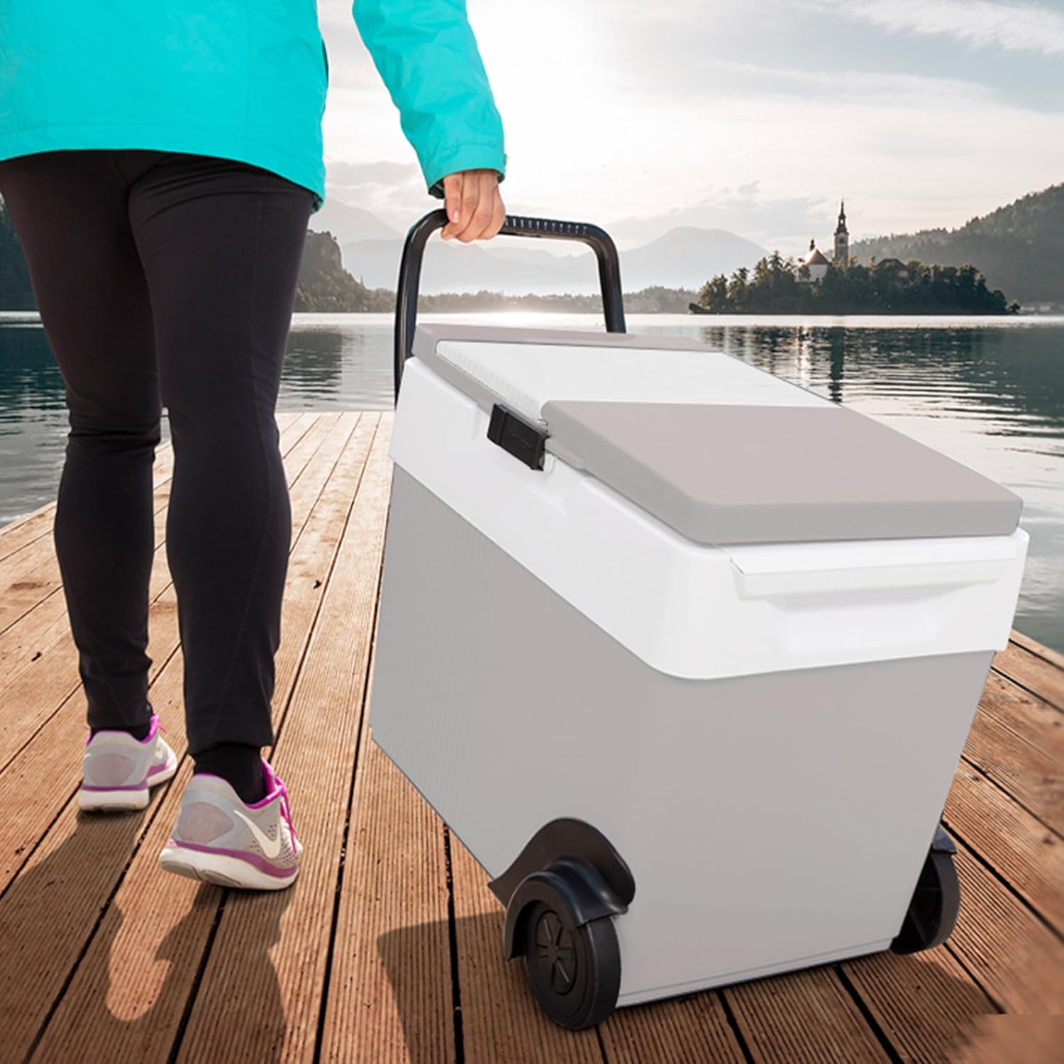 Image: A person easily transports the Koolatron W65 AZ cooler/warmer using its integrated wheels and tow handle, highlighting its portability for outdoor activities.
