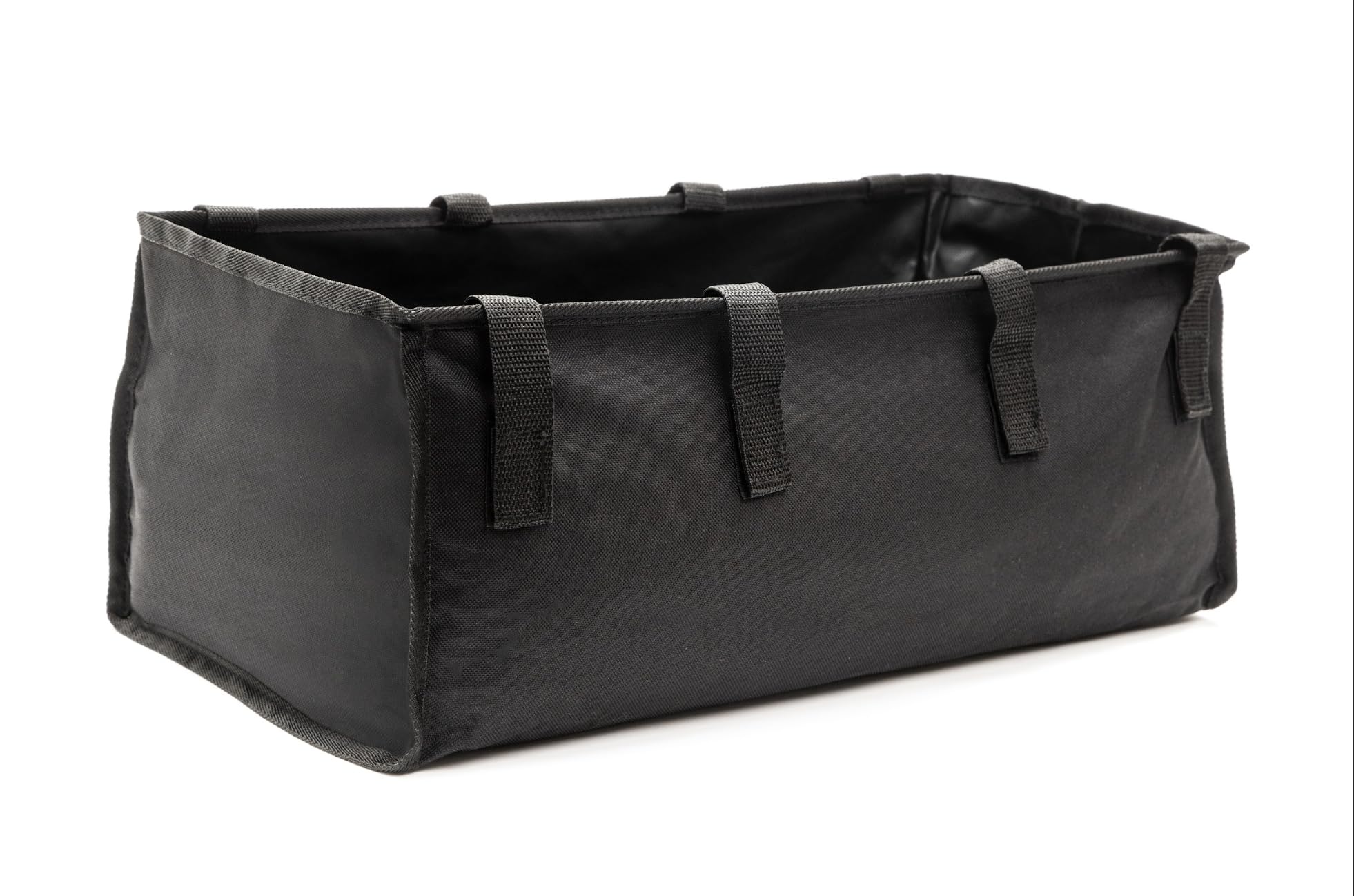 Image 1: The Helavo Replacement Bag. This image shows the black fabric bag, designed to attach to a rolling walker frame. It features multiple fabric loops along the top edge for secure attachment.