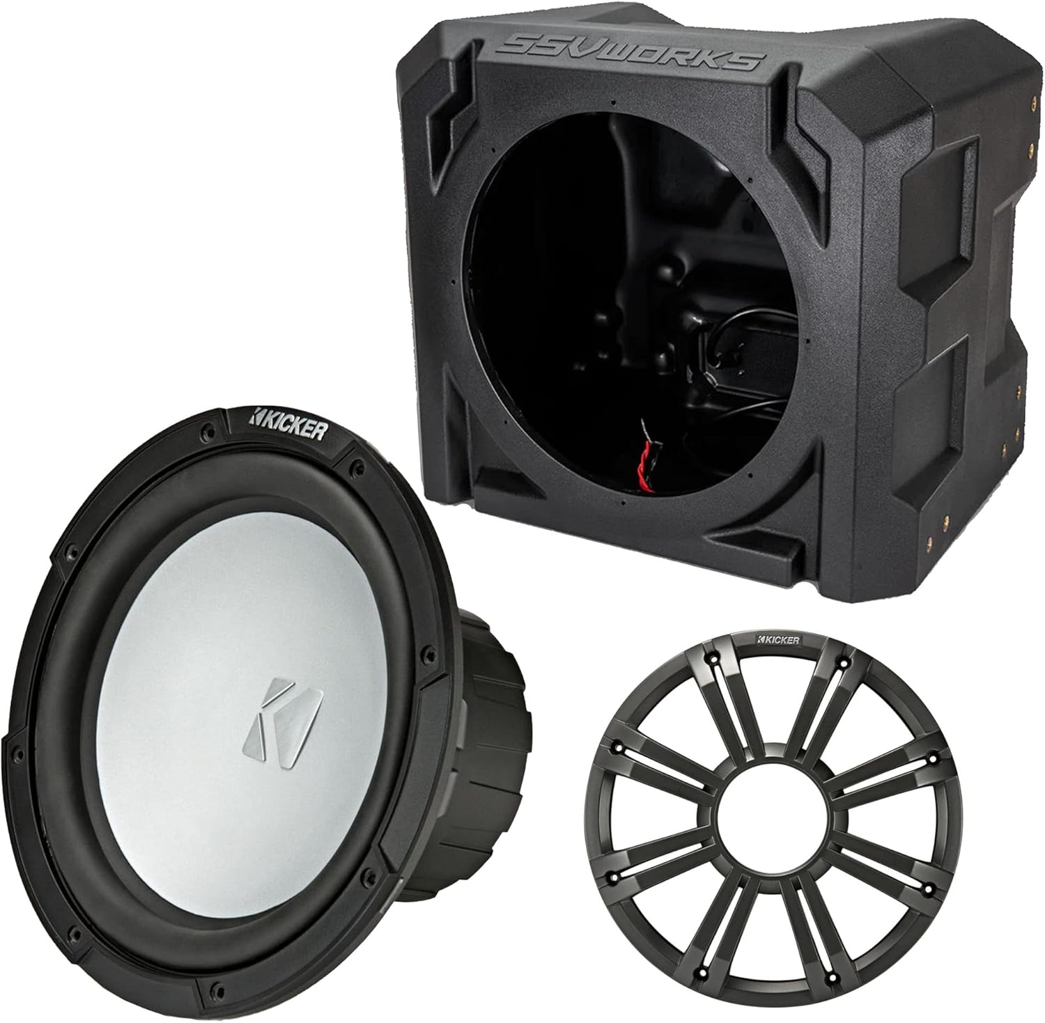 Image 1: Kicker 45KM104 10-inch Marine Subwoofer, SSV Universal Marine Sub Box Enclosure, and Charcoal LED Grill. This image displays all primary components included in the product bundle.
