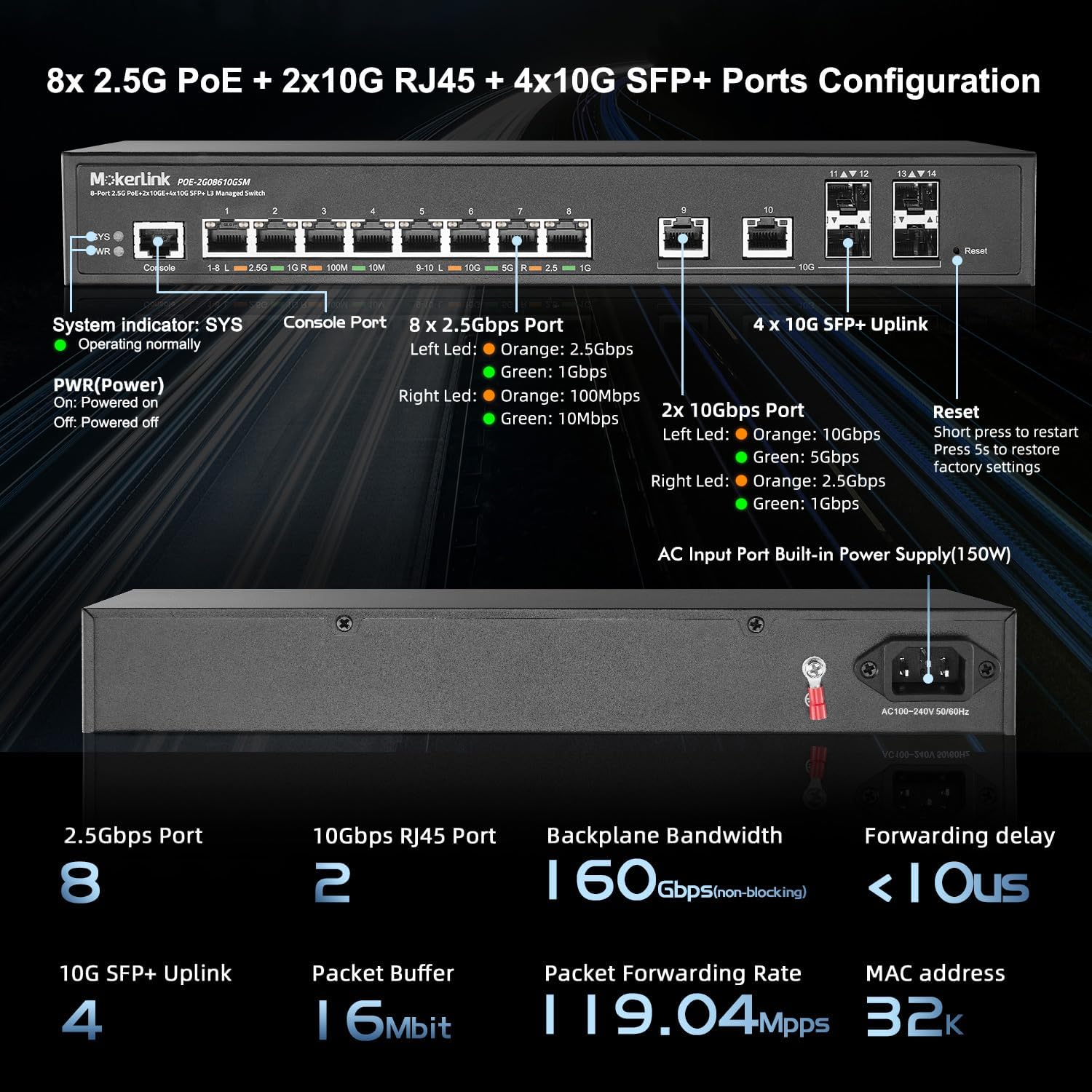 - MokerLink 8-Port 2.5G PoE+ 6x10G SFP+ L3 Managed Switch
