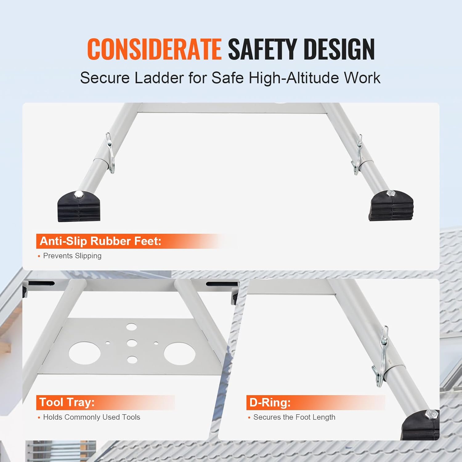 The VEVOR Ladder Stabilizer is designed to enhance stability and safety when working at height, particularly for tasks involving roof gutters or walls. It features adjustable feet, anti-slip rubber pads, and a robust carbon steel construction.