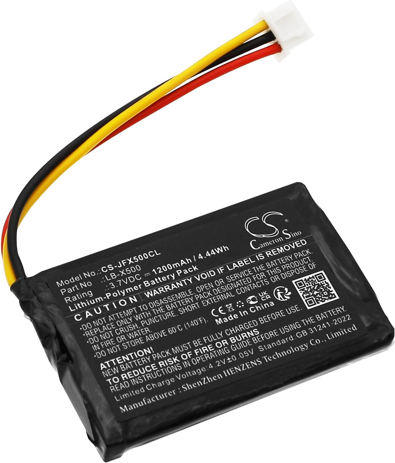 Image: Cameron Sino replacement battery for Jetfon X500. This image displays the battery's front side, clearly showing its model number, part number, voltage, and capacity, along with important safety warnings and certifications. The attached wires (red, black, yellow) lead to a white connector.
