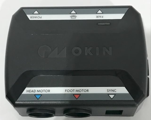 Gambar 1: Top view tina Okin Control Box CB.12.20.02, némbongkeun labél 'POWER', 'PASANGAN', 'HEAD MOTOR', 'FOOT MOTOR', sarta 'Sync'.