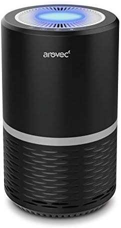 Figure 1: Arovec H13 True HEPA Air Purifier. This image shows the compact black cylindrical air purifier with a blue light emanating from the top air outlet, indicating operation.