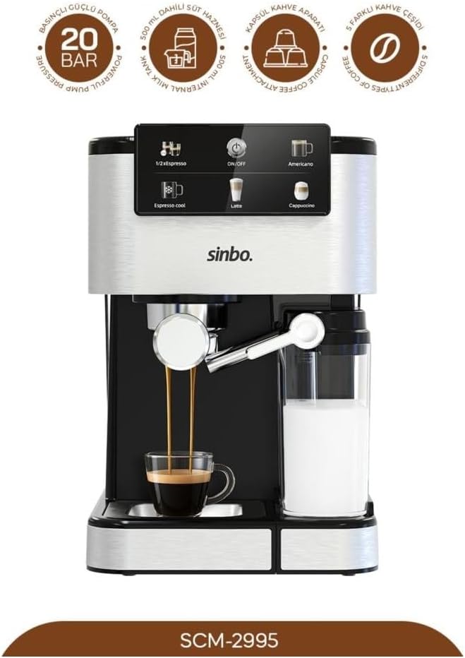 Sinbo SCM-2995, kullanım kolaylığı ve mükemmel kahve kalitesi için tasarlanmış çok yönlü bir espresso kahve makinesidir. Çeşitli kahve hazırlıkları için 20 bar basınç pompası, 1.5 litrelik su tankı ve 500 ml'lik dahili süt tankına sahiptir.