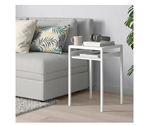Image: The assembled Ikea NYBODA Side Table, featuring its clean lines and functional design, positioned beside a sofa. It showcases the table's compact size and suitability for living spaces.